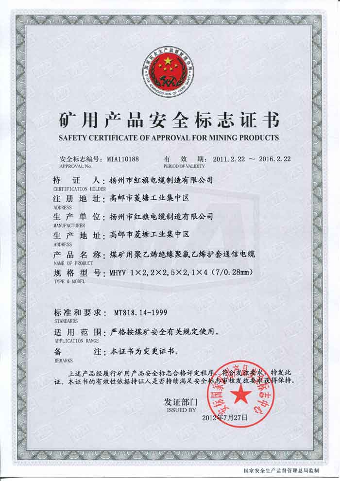 煤礦礦用產(chǎn)品安全標志證書-MHYV0.28