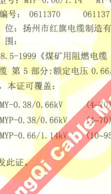 國(guó)家采煤機(jī)械質(zhì)量監(jiān)督檢驗(yàn)中心檢驗(yàn)合格證--煤礦用阻燃電纜(MYC-0.66/1.14,MY-0.38/0.66)