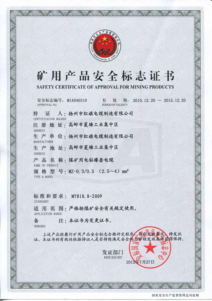 煤礦礦用產(chǎn)品安全標志證書-MZ