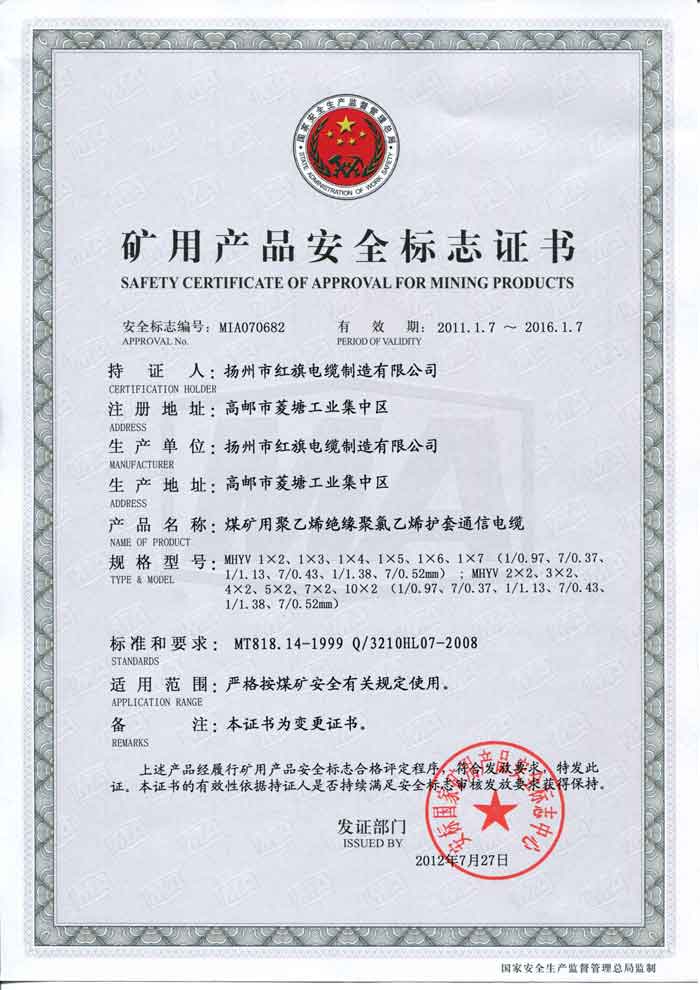 煤礦礦用產(chǎn)品安全標志證書-MHYV
