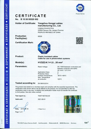 日前,在紅旗全體電纜人的共同努力下,紅旗電纜公司生產(chǎn)的太陽(yáng)能光伏電線電纜成功通過了德國(guó)萊茵(簡(jiǎn)稱TUV)認(rèn)證,本次認(rèn)證覆蓋了歐盟EN50618:2014和德國(guó)VDE-AR-E2283-4:2011兩個(gè)標(biāo)準(zhǔn)的光伏電線電纜,電線從1×1.5m㎡到1*35m㎡的全部規(guī)格、電纜從2×1.5m㎡到2*6m㎡的全部規(guī)格。