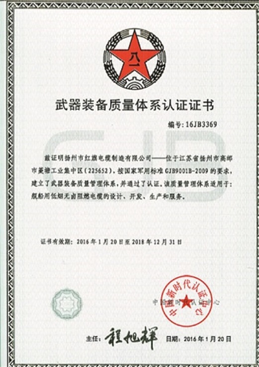 熱烈祝賀揚州紅旗電纜公司取得武器裝備質(zhì)量體系認(rèn)證證書